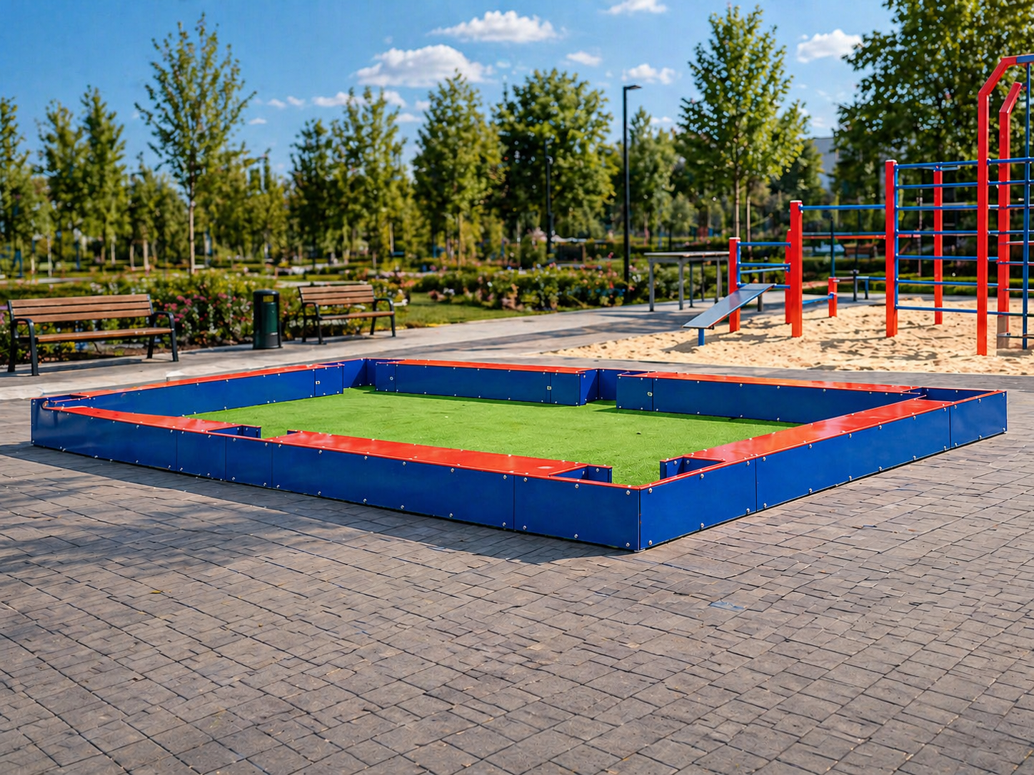 - Nawierzchnia urządzenia wykończona sztuczną trawą o strukturze monofilowej, wysokości włókien 11mm oraz gęstości włókien 1 300 tyś/m2;